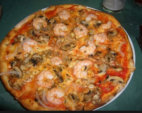 جمبري، حبار، سرطان البحر، موزاريلا، صلصة البيتزا والفلفل الملون.