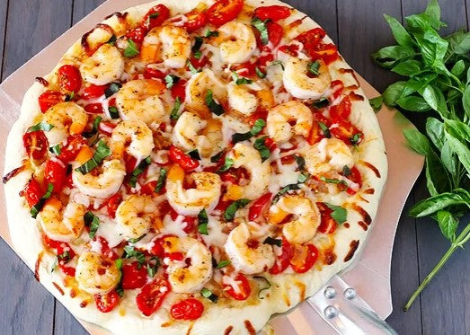 جمبري، موزاريلا، صلصة البيتزا والفلفل الملون.